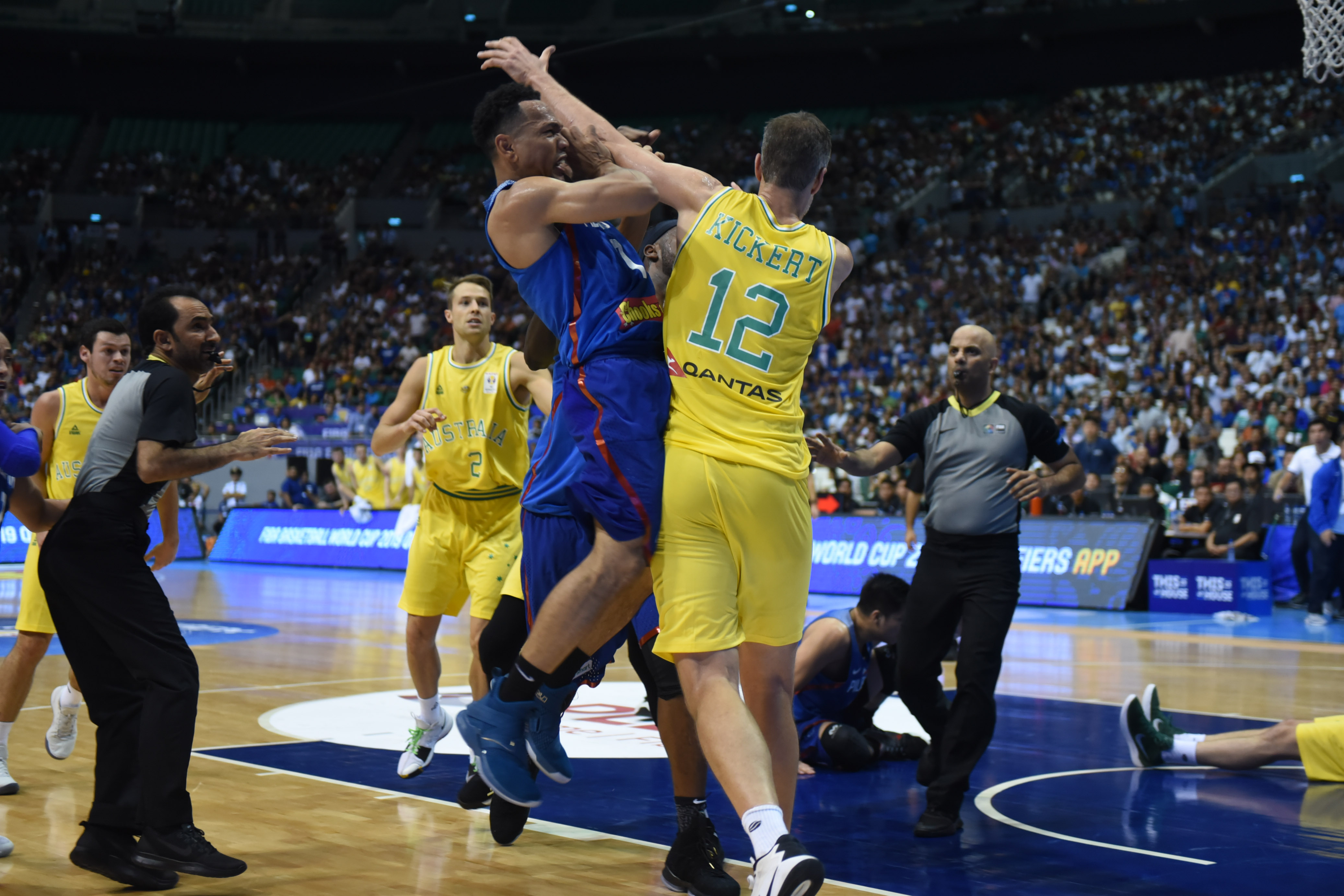 The brawl began with 4:01 left in the third quarter with Gilas Pilipinas down, 79-48, when action on the court became too physical when Chris Goulding and Pogoy were pushing each other twice. Goulding fell down to the ground, prompting Kickert to retaliate by shoving Pogoy, and triggering the free-for-all.