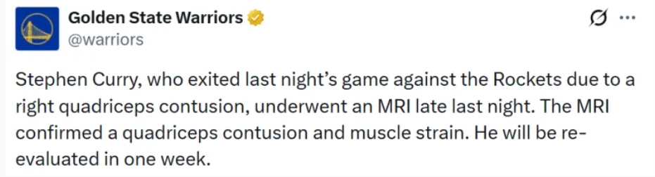 The injury occurred in the final moments of the Warriors’ 100–104 home loss to the Houston Rockets, when Curry was seen limping off the court. Initially, the team announced he had sustained a right quadriceps contusion.